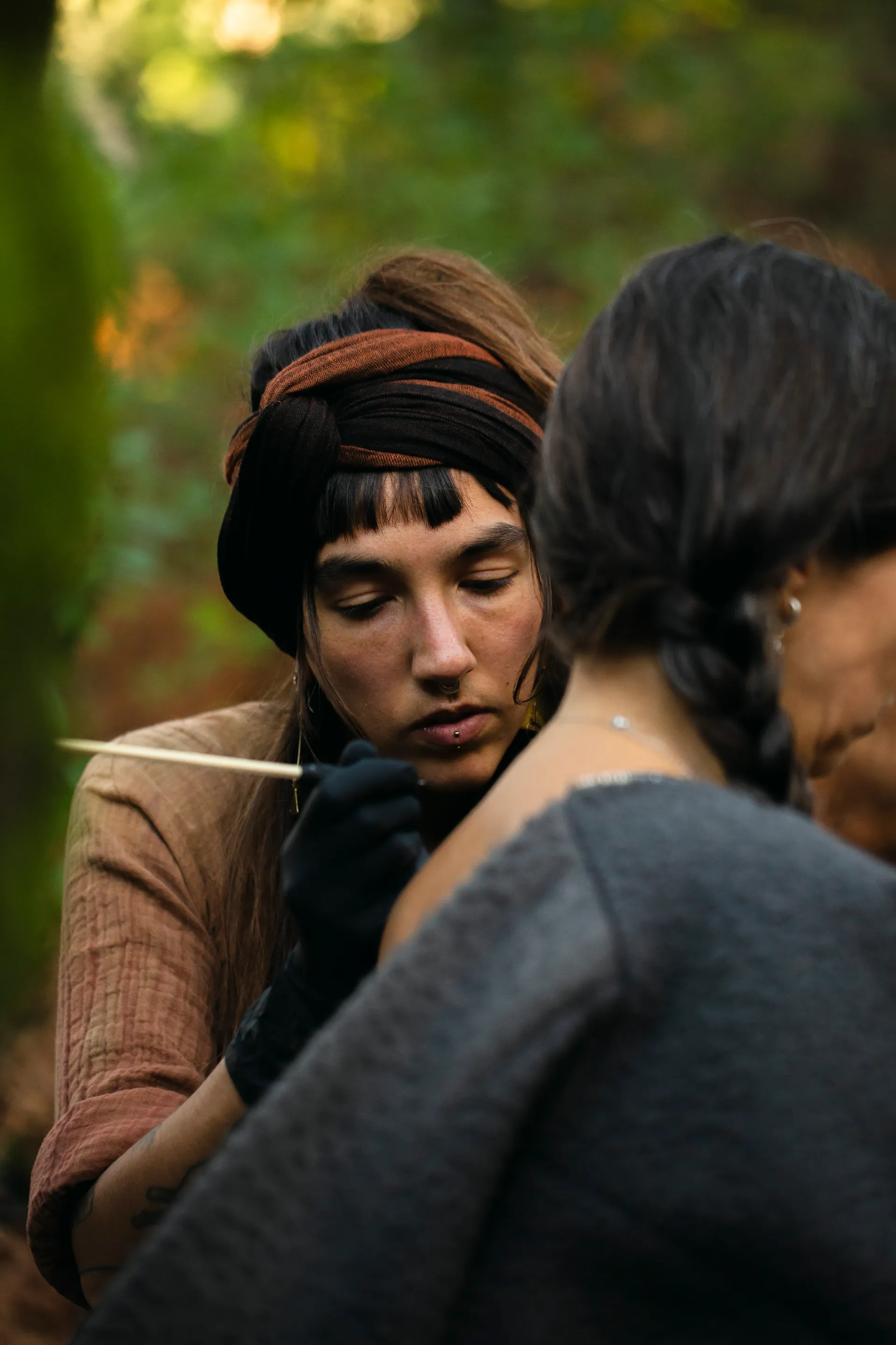 Receiving the magic of your soul through each gentle poke. Honoring the ways of all that have come before us. Every poke a slow and steady rhythm. Memory of a language written in your skin.